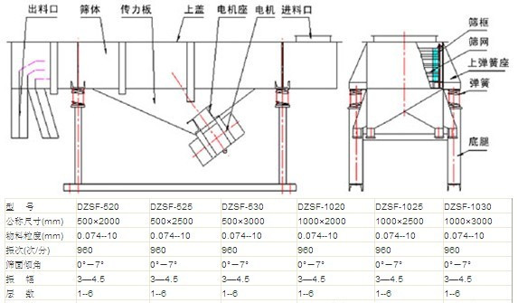 當縱向安裝在篩體上的兩臺振動電機兩端的偏心塊便產生額定激振力,其產生在橫向的激振力相互抵銷,其縱向的激振力通過傳振體傳遞到整個篩面上,從而使篩面上的物料受其激振力而在篩網(wǎng)面上向出料口方向跳躍運動。小于篩孔的物料通過篩孔落到下層,大于篩孔的物料經(jīng)連續(xù)跳躍后,經(jīng)出料口流出,由于篩分過程合理,可將物料經(jīng)振動篩分級后,取得幾種不同顆粒的物料,完成物料的分級。